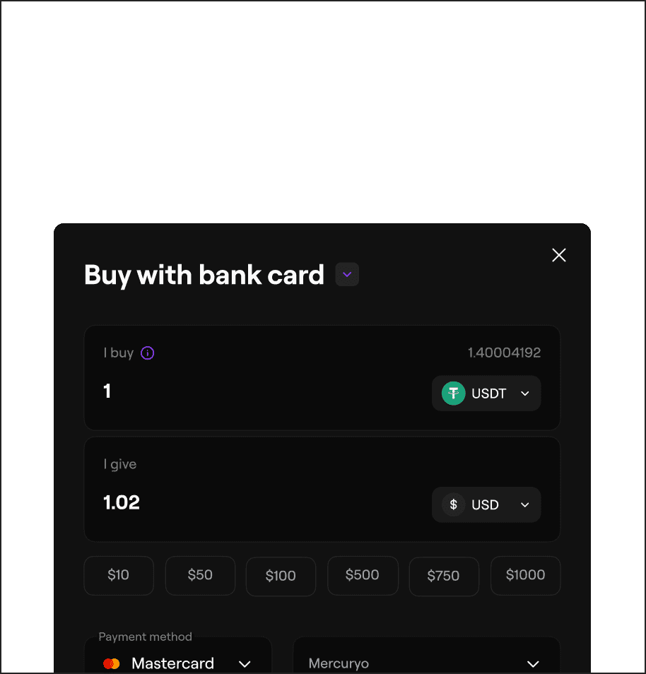 Get BTC, ETH, USDT and other assets straight from your bank card. Prices update in real time