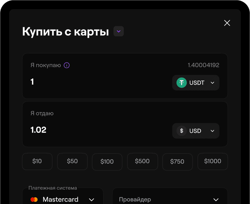 BTC, ETH, USDT и десятки других активов с банковской карты.